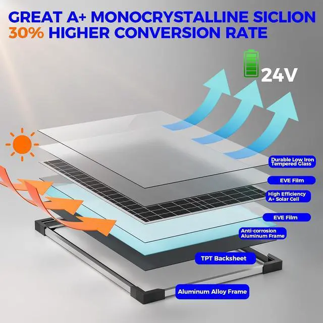Wide Application Range: This 24v solar panel kit is versatile and designed to fit a wide range of applications, making it suitable for various vehicles and settings, including RVs, boats, trucks, camping gear, generators, tractors, cars, campers, and more. Its flexibility extends beyond just vehicles and can be used in a variety of other applications, such as Lawn mowersChicken coopsWeather stationsElectric fencesGate openers and Off-grid use. - High-Efficiency Monocrystalline Solar PanelThis 50W 24v monocrystalline solar panel kit has an effective conversion rate of up to 30%, making it an ideal choice as a solar battery maintainer for a wide range of 24V rechargeable batteries, including LiFePO, Lithium Ion, AGM, SLA, GEL, EFB, and MF batteries.