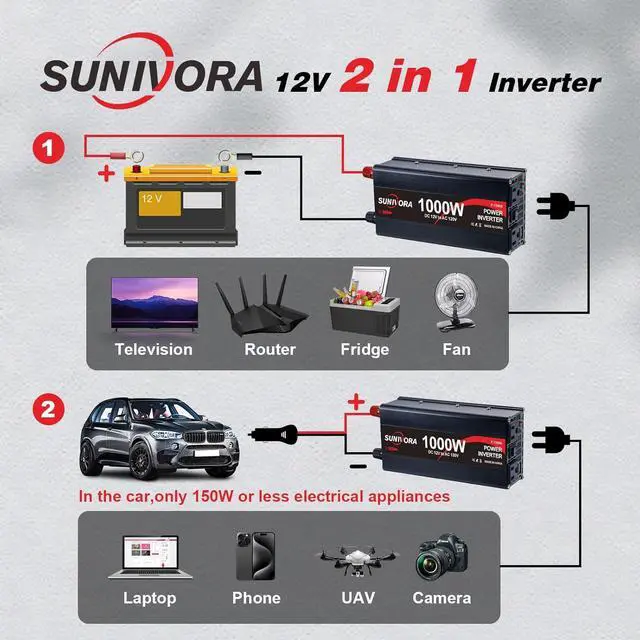 - What You Will Get: Sunivora 1000W Power Inverter with 20-inch cigarette lighter plug, 1 set of battery cables (1x red, 1x black), user manual, 12-month warranty, and friendly customer service. If you aren't satisfied with the product, please feel free to contact us, and we will solve it for you in the first tim