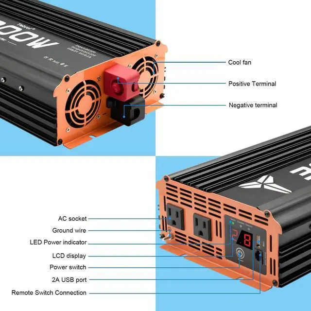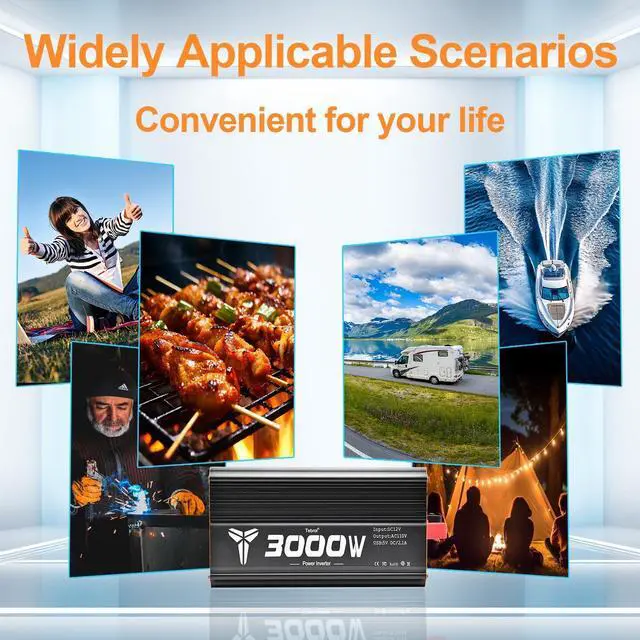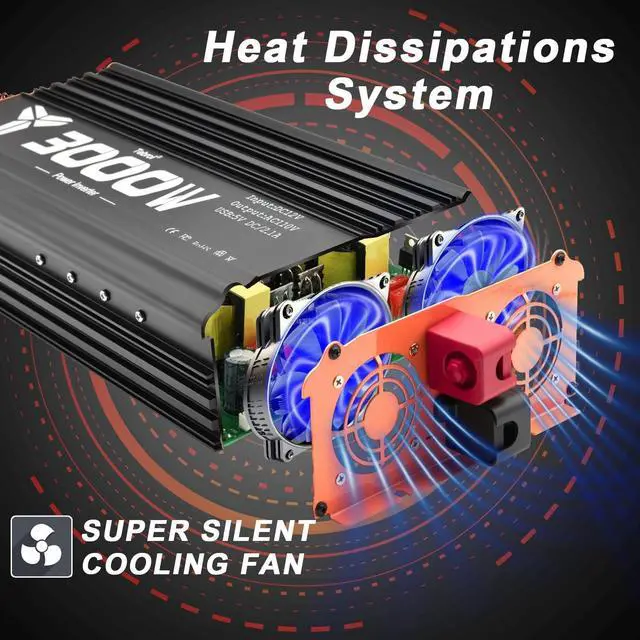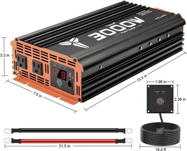 When the internal temperature of the machine reaches a certain level, the fan rotates to effectively reduce the temperature. {Remote Control and LCD Display} It's easier and more comfortable to check the inverter's operating status from anywhere, anytime, making it safer for you to use. Equipped with a remote control, it ensures that you have the information you need to keep everything running smoothly, whether you're camping, traveling, or powering up your equipment at home. - {3000W Power Inverter} Provides 3000 Watts continuous DC to AC power output, 3000 watts continuous power, 6000 watts peak power.