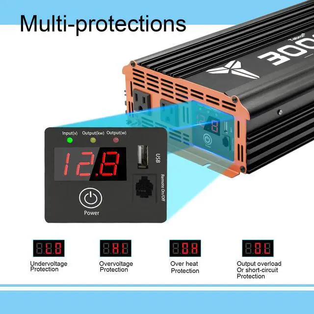 12V DC to 110V AC Power Inverter, Connect DC battery cables directly to your car vehicle's battery. Please confirm the rated power and starting power of your devices before purchasing. - {Safety protection} This 3000 watt inverter has Multiple protections: overvoltage, undervoltage, overload, short circuit, overheating and soft start technology. Equipped with dual cooling fans, excellent heat dissipation performance. Ensure your safety during use and extend the service life of the inverter. - {Multiple usage scenarios} You just need to connect the car power inverter to the 12V battery through a cable, and you can use 110V AC power anytime and anywhere. Ac appliances or devices for power outages, emergencies, hurricanes, holidays, cars, RVS, trucks, solar power, remote workplaces, or any place that requires AC power, such as TVS, ovens, floodlights, laptops, DVDS, players, cell phones, ipads, PSPS, cameras, etc. - {Intelligent fan cooling} Inverter for vehicles uses an intelligent fan system to dissipate heat during the entire operation. When the internal temperature of the machine reaches a certain level, the fan rotates to effectively reduce the temperature. - {Remote Control and LCD Display} It's easier and more comfortable to check the inverter's operating status from anywhere, anytime, making it safer for you to use. Equipped with a remote control, it ensures that you have the information you need to keep everything running smoothly, whether you're camping, traveling, or powering up your equipment at hom