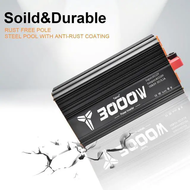 {3000W Power Inverter} Provides 3000 Watts continuous DC to AC power output,3000 watts continuous power, 6000 watts peak power. 12V DC to 110V AC Power Inverter, Connect DC battery cables directly to your car vehicle's battery. Please confirm the rated power and starting power of your devices before purchasing.{Safety protection} This 3000 watt inverter has Multiple protections: overvoltage, undervoltage, overload, short circuit, overheating and soft start technology. Equipped with dual cooling fans, excellent heat dissipation performance. Ensure your safety during use and extend the service life of the inverter.