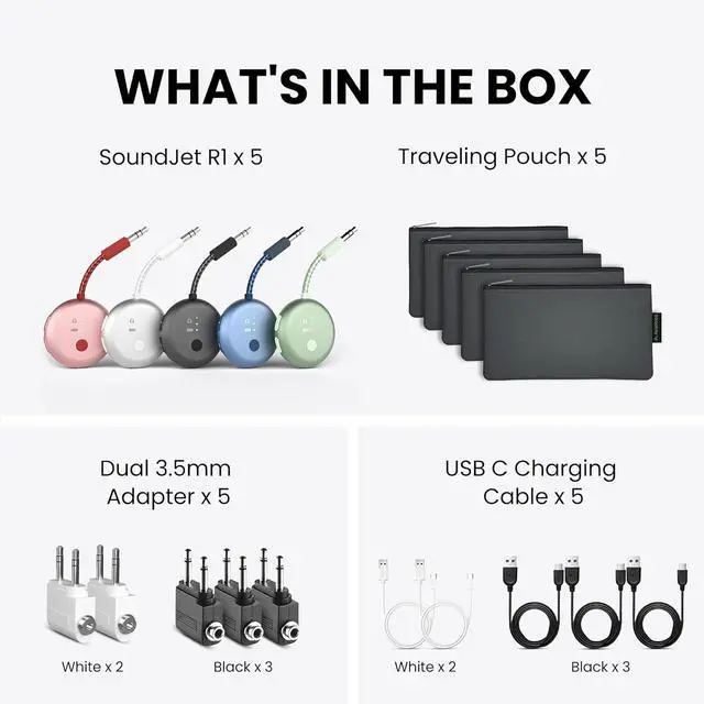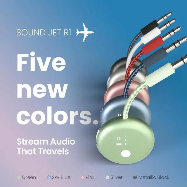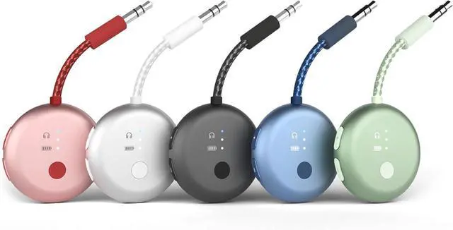 LONG-LASTING 20-HOUR BATTERY LIFEEach adapter supports up to 20 hours continuous playback, perfect for long trips and daily wireless needs. falseFIVE-COLOR SET FOR EASY SHARING & PERSONALIZATIONIncludes five vibrant colors, perfect for families, friends, or groups to easily personalize and share wireless audio adapters. false- DESIGNED FOR AIRPLANE TRAVEL & BEYONDConnect multiple Bluetooth headphones or AirPods to airplane seatback audio via AUX jack or dual-prong adapter. Perfect for flights and everyday wireless audio use.