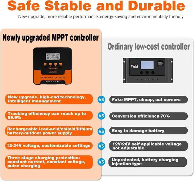 Compared to traditional PWM controllers, this MPPT solar charge controller increases efficiency by over 30%, with a conversion efficiency of 99.9 %, improving charging efficiency and extending battery life