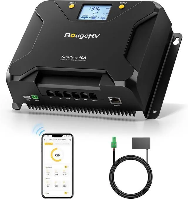 - SMART LCD AND APP CONTROL: Sunflow 40 amp MPPT controller also features a remote app control, the Bluetooth range is up to 32 feet. Stay informed with the BougeRV APP that provides the solar panel, battery and load status. The controller provides 3 modes for display operation, full-featured mode, no-load mode, and viewing mode, you can select the full-featured mode to modify all adjustable parameters via the screen button if you don't want to download an app.