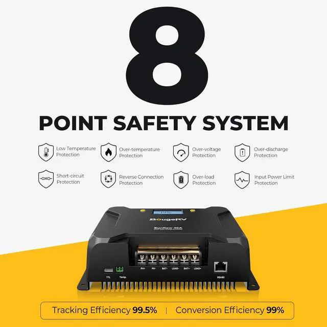 - ACTIVE SHIELD: Certified by CE and RoHS. BougeRV 40A MPPT renewable energy controller features a dual MOS circuit to prevent the reverse current and reduce the heat in operation. With 6 protections, over-temperature, open-circuit, short-circuit, overload, polarity reverse prevention circuit, flow backward of current protections.
