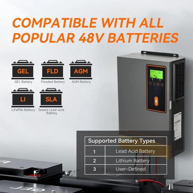 Multiple Type Batteries: 140amp solar charge controller compatible with a variety of 48V batteries (Lead-acid and lithium, User