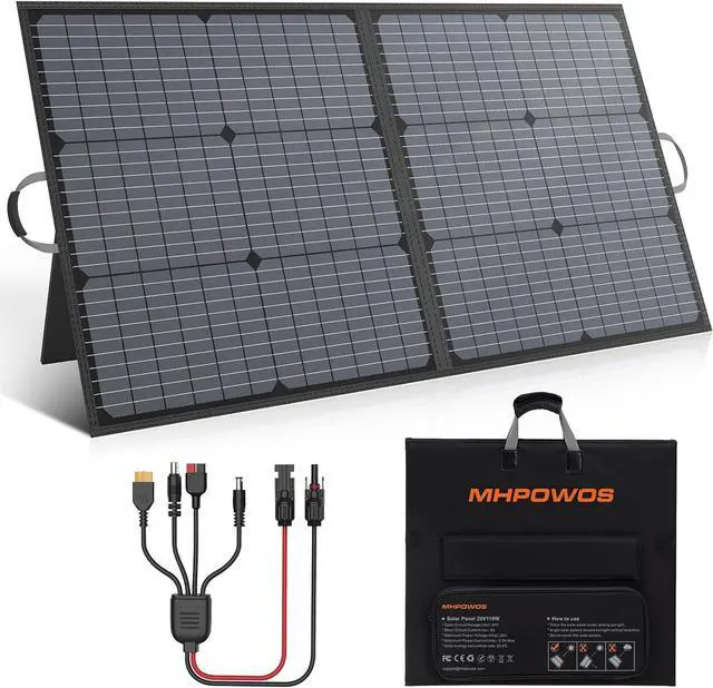 Compatible with Most Solar GeneratorsMHPOWOS 110w solar panel equipped with a solar extension cable, which can be seamlessly connected to our 4-in-1 cable interface (Anderson/XT60/DC7909/DC5521), ensuring compatibility with most portable power station / solar generator on the market. The voltage of the 100w solar panel is 20V, please carefully verify your power station model and check if it has a maximum input power limit before placing your orderEasy to installPortable solar panel for power station is equipped with professional solar system output interfaces, plug and play. The 100 watt solar panel charger features a lightweight design, once unfolded, 2 kickstands allow for easy positioning on any flat surface to give you instant charge from sunlightDesign for Outdoor ActivityIdeal as an RV solar panel, camping solar panel and outdoor panel.