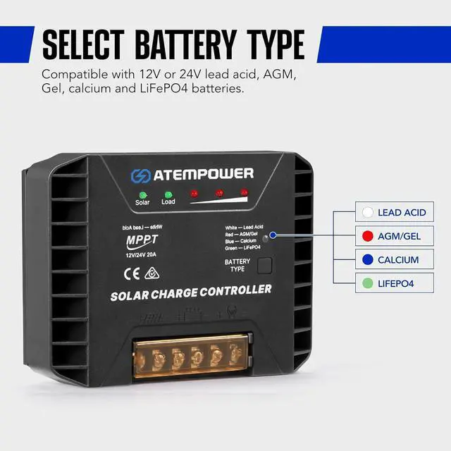 - Greater Compatibility: ATEM POWER MPPT solar charge controller/MPPT solar regulator, which is equipped with an automatic system for voltage recognition, supports 12V/24V systems. Charge controllers for solar panels capable of automatically detecting system voltage once connected to a lead acid, AGM, Gel, calcium and LiFePO4 battery. If youre aiming for the best, do not miss this MPPT solar regulator/MPPT solar controller 12/24V.