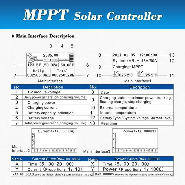 - LCD Display---clear to see operating data and working condition, Real-time energy statistics function with Multiple load control modes, Chinese and English, multi-function LCD screen and operation menu. Display the daily power generation curve and current curve. Display fault records, to facilitate customer troubleshooting in a timely manner.
