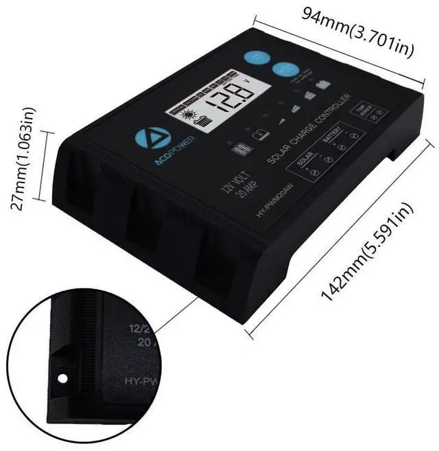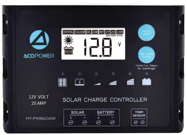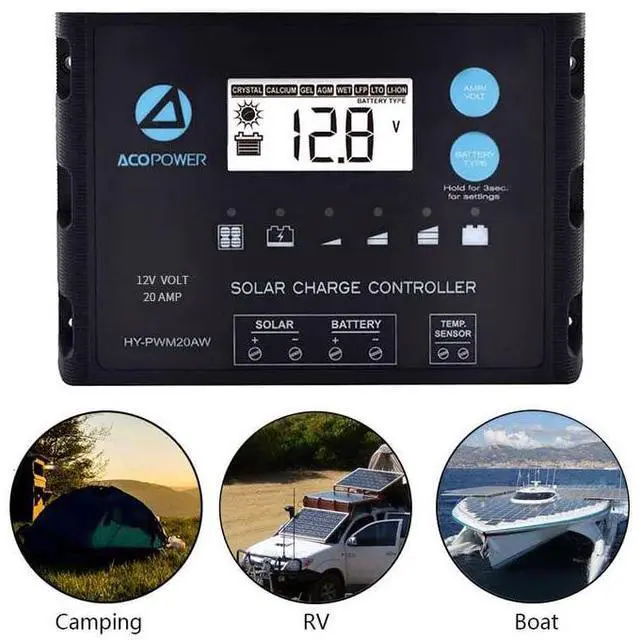 Versatile CompatibilitySupporting 8 different battery types: Lithium-ion, LiFePO4, LTO, Gel, AGM, Flooded, Crystal, and Calcium. With a continuous charging capacity of 20 amps at 12V, it can handle up to 12V/360 wattsfalseBacklit LCD Displaying SystemProvides real-time insights into charging current, energy output, temperature, battery voltage, and error codes, empowering users with precise control over their charging operationsfalse- 4-STAGE PWM TechnologyEngineered with advanced PWM technology, pwm controller optimizes charging across Bulk, Absorption, Float, and Equalization stages to protect and extend battery life