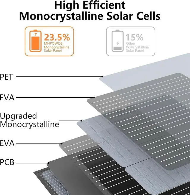 Design for Outdoor ActivityLightweight and foldable, portable solar panel is an essential power companion for camping, fishing, RV trip and other outdoor adventures. You can charge your device no matter when you are driving, fishing, mountain climbing, etc. The solar panel is designed with thickened handles to enhance your outdoor experiencefalseCompatible with Most Solar GeneratorsMHPOWOS 110W Portable solar panel equipped with solar extension cable to Anderson/XT60/DC7909/DC5521 cable. The package contains a 110W foldable solar panel, solar extension cable to xt60 cable, instruction manual. If you have any questions with our solar panel, please contact usfalse- Highly Efficiency Solar PanelCrafted with advanced mono-crystalline solar cells, 110W portable solar panel can achieve 23.5 % conversion rate.