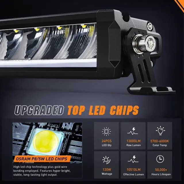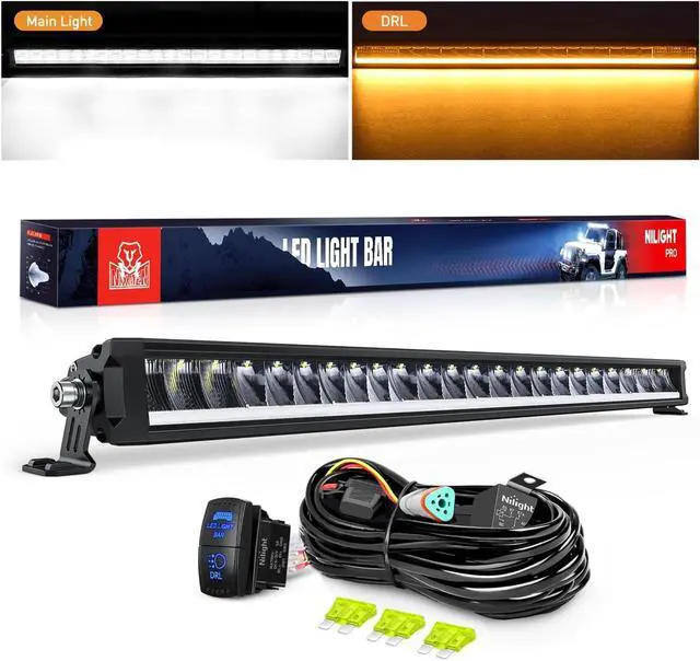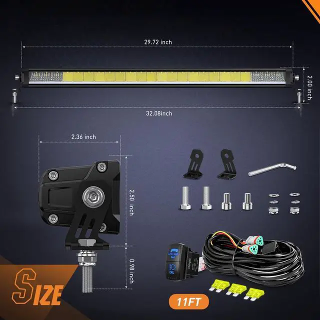 Perfect Spot Flood Combo w/DRL: Combining 10°super spot light in the middle and 90°flood light at two sides. Get you both high-intensity spot light for further distance and also bright flood light at broader distance. Clear all darkness forward and at side roads for your nighttime driving. It also designed with amber DRL for extra safety for daytime ridePremium Durability IP68 waterproof rated, powerful to withstand any harsh environments and weather conditions. Solid built in quality 6063 and ADC12 aluminum housing and thick heat shrink shell, efficiently accelerate heat dissipation and maintain a safe temperature to ensure stable lighting output as well as lighting durabilityUpgraded Dual Control Rocker Switch DT Wiring KitComes with 14 AWG dual control wiring kit that includes switch relay and fuse all in one set. Just directly hardwired the color-coded wires on the wiring kit and lights, and then connect the power cord to the power source. The newly upgraded dual-control power rocker switch with two button colors allows you to control the LED light more easily at night- Trusted Hyper BrightEmploy top-notch P8/5W LED chips, total 120 watts per light, with lighting performance 13000LM/PC, 4580Lux@10Meters, 1Lux@677Meters (2221FT).