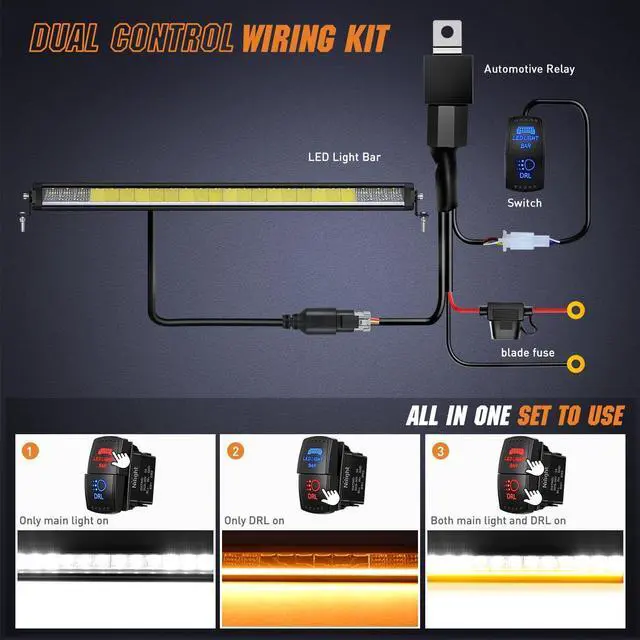 - Upgraded Dual Control Rocker Switch DT Wiring KitComes with 14 AWG dual control wiring kit that includes switch relay and fuse all in one set. Just directly hardwired the color-coded wires on the wiring kit and lights, and then connect the power cord to the power source. The newly upgraded dual-control power rocker switch with two button colors allows you to control the LED light more easily at night