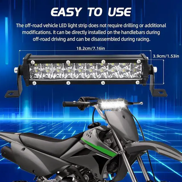 The light strip has a reasonable design and is rainproof and moisture-proof, making it easy to clean and maintain. false- UNIVERSAL - The motorcycle light bar fits almost all dirt bikes/pit bikes with 7/8" handlebars. For example CRF XR RM KX KLX TTR PW SSR Apollo TAO TAO SDG and more.