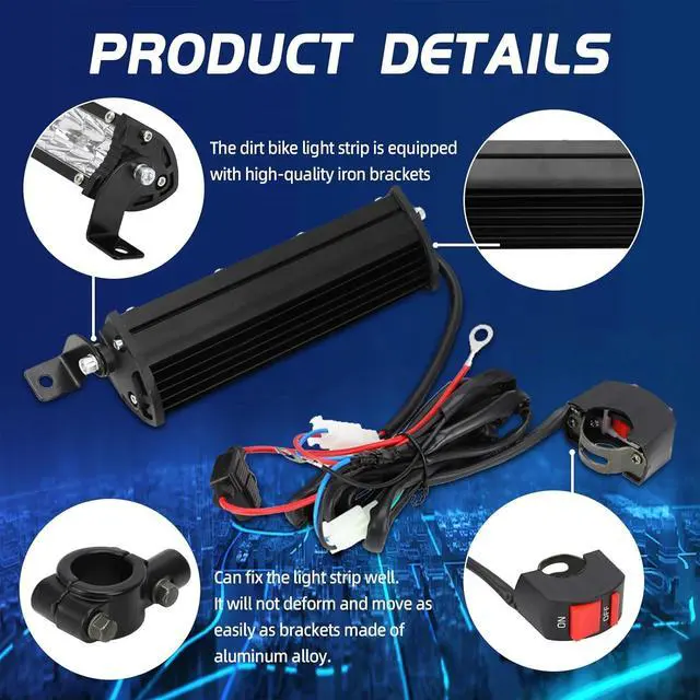 - STURDY BRACKET - The dirt bike light bar is equipped with a premium iron bracket, which can fix the light bar well and keep the light in the irradiation range you need for a long time. It will not deform and shift as easily as the bracket made of aluminum alloy.
