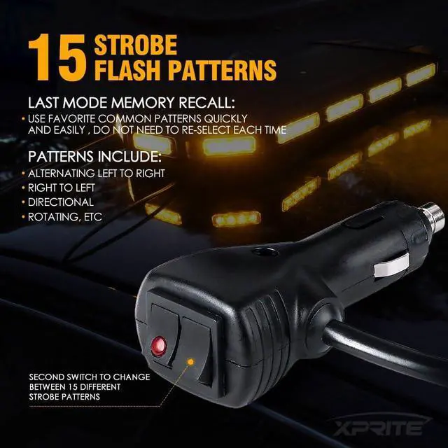 - 15 STROBE PATTERNS: You can choose from 15 different strobe patterns. Patterns include Rotating, Flashing, Alternating Left to Right, Right to Left, Traffic Advisor, etc. Also has a Memory function to recall the last pattern used.