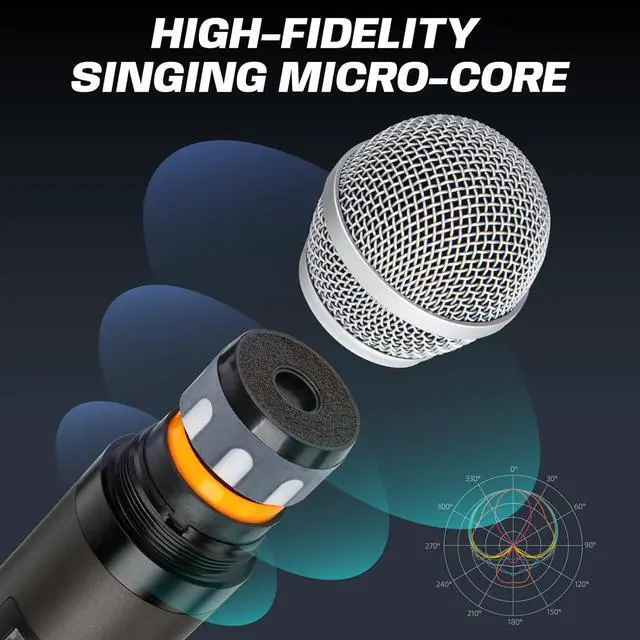- Unidirectional Cardioid Dynamic Microphone - The cardioid dynamic coil design of our wireless microphone system allows for perfect reception of frontal sound, filtering out unwanted noise from other directions. This results in clear, detailed vocals, effectively eliminating background noise and feedback for an unparalleled audio experience.