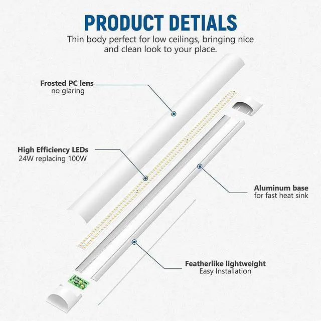 - AMPLE LIGHT AT LOW COST The 3feet flat panel lights are built with high-efficient LEDs, 24W at 2880lumen, replacing 80W old incandescent/fluorescent light, giving Sufficient brightness for the whole room and saving 80perscent energy. No need to replace blasts and no bulbs required.