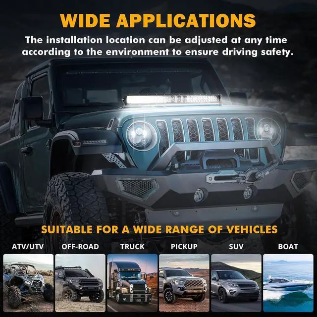- SUPER BRIGHT COMBO BEAMWith the dual combination of spot and flood light bars, the lighting effect will be superior to other single function lights. This provides a brighter, wider and longer driving field of vision without dark spots or halos, effectively reducing blind spots and improving driving safety.