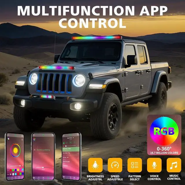 - 16.7 Million Customizable Colors These driving lights feature a trinity white & RGB design, offering 16.7 million customizable colors via a mobile app. Easily adjust the color, brightness, speed, and choose from 20 dynamic modes for versatile lighting effects.
