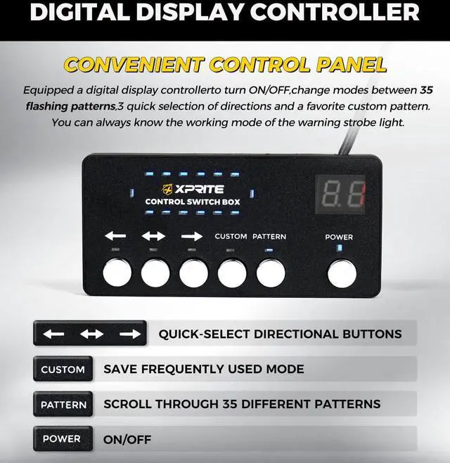 - Flash Patterns: The controller equipped with our strobe light bar has six button switches, enabling 35 different flashing modes. Moreover, this strobe light has a memory function, allowing you to save your favorite mode for fast emergency response