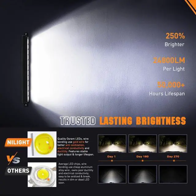 - Trusted Hyper BrightEmploy top-notch Osram P8/5W led chips, total 240 watts per light, with lighting performance 24800LM/PC, 6200Lux@10Meters, 1Lux@787Meters (2582FT). Features a trusted ultra-bright, high-intensity, stable light output. Improves driving safety with a clearer, wider, and further visual area. Lifespan extends over 50, 000 hours