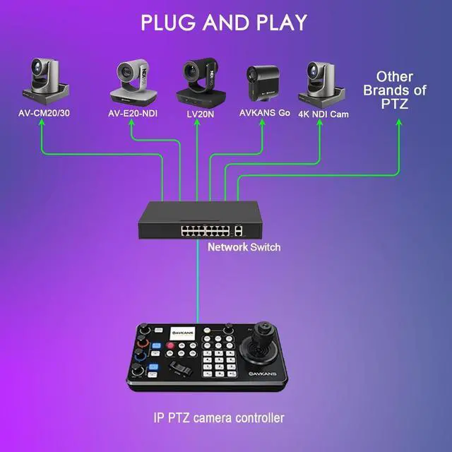 - IP CAMERA CONTROLLER WITH POE: Plug and play. With one single Ethernet cable(Cat5/6), you can power on this joystick controller, and control all the cameras on the networks. Compatible well with AVKANS PTZ Cameras and other brands of PTZ Cameras.