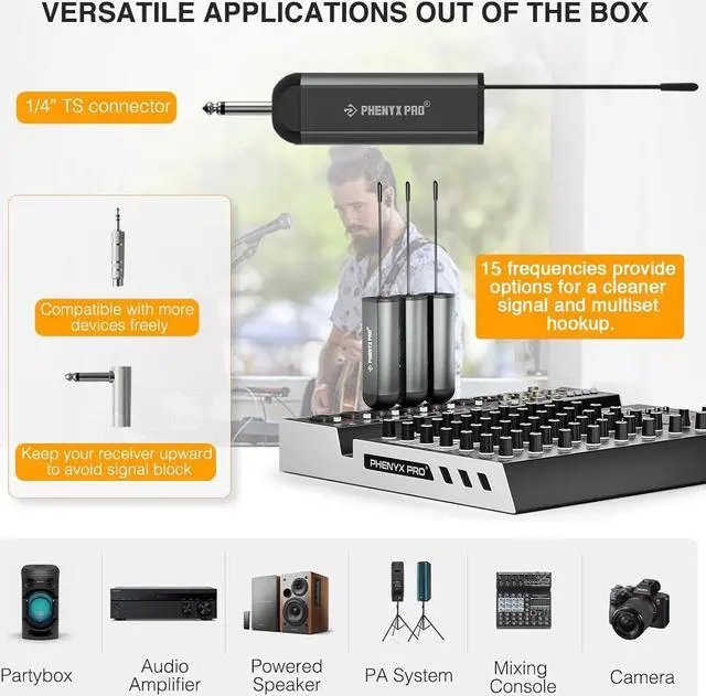 - ALL-IN-ONE PACKAGE: 1 x receiver with a 6.35 mm plug, 1 x bodypack transmitter, 1 x headset mic, 1 x lapel/lavalier mic, 1 x USB-C dual charging cable, 1 x 6.35 mm to 3.5 mm adapter, 1 x angle TS male to 1/4" TS female adapter to keep receiver antenna upward, 1 x user's manual.