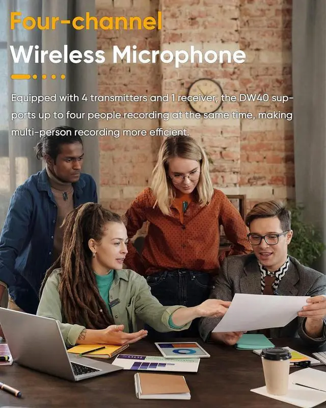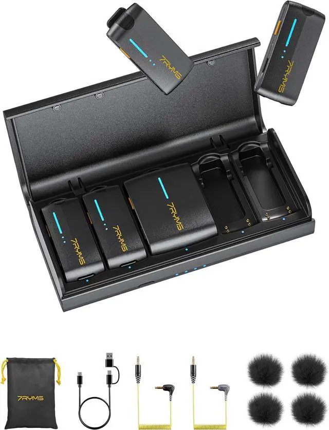 Multi-functional Wireless MicrophoneEnhance your video recording experience with our versatile wireless camera microphone. With four-level volume adjustment, one-key muting, and M/S switch, this microphone helps users adjust according to shooting needs, avoid accidents and noise, achieving optimal sound quality for your videos. falseDigital/Analog Output ModesThe DW40 wireless lavalier microphone offers USB C digital and 3.5 mm analog output options. You can use this microphone kit to be compatible with a variety of cameras, smartphones, and computers, providing versatility for different recording scenarios. false- 4-Channel Mini Lavalier Microphone System7Ryms iRay DW40 wireless mic comes with 4 Transmitters and 1 Receiver, which can pick up sounds from one or up to four people.