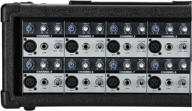 This powered mixer is rugged and tough! It is enclosed in a high quality wooden enclosure which can take a real beating! This model has 8 channels making it versatile enough for most parties and gigs. It has adjustable delay and echo effects, along with individual controls on each channel for reverb, bass, and treble.