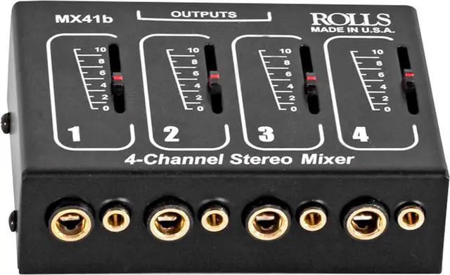 Package Weight: 0.283K gfalseThe MX41s is a stereo, four channel passive mixer for expanding a console mixer, mixing instruments, CD or cassette players, or other signal sources. It requires no batteries or other power source. The unit may also be used as a stereo 1-in 4-out box when all controls are turned completely clockwise.