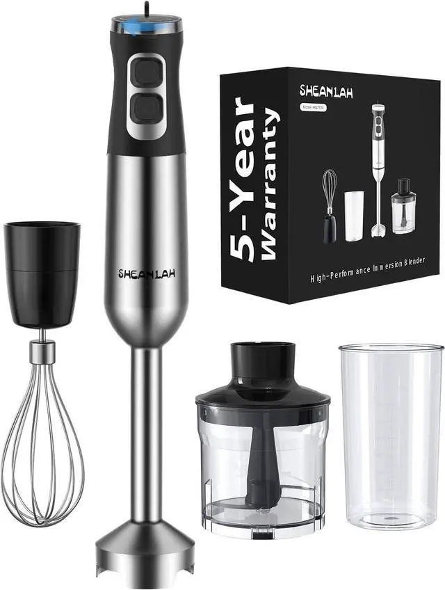 4-Blade Titanium HeadOur immersion blender features a 4-blade titanium head for superior performance. Compared to standard 2-blade designs, it blends more efficiently, This cutting-edge design not only improves blending efficiency but also extends the lifespan of the blades, making it a reliable choice for all your culinary needs. false4 in 1 Hand BlenderOur hand blender comes with a whisk, beaker, and chopper, making it incredibly versatile for preparing a wide range of recipes. Whether you're making smoothies, pureeing vegetables, or tackling baking tasks, this all-in-one tool helps you achieve perfect results with ease.