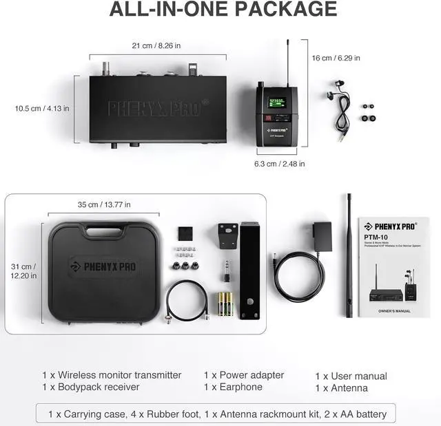 - SMART DESIGN: This sistema de monitoreo in ear features a metal transmitter for durability and comes with a carrying case for portability. The adapter cord tie-off and removable feet enhance convenience in professional settings, while the XLR and 6.3 mm hybrid inputs increase compatibility for diverse audio needs. Additionally, the stereo ear monitor system includes an LCD panel that displays system details, and earbuds that provide purer sound. For professional use, metal racks are also included