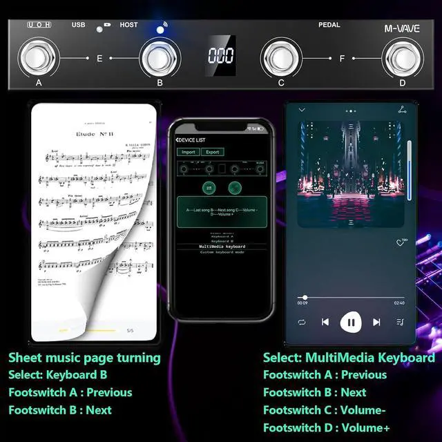 - Durable Construction: Constructed with high-quality materials, ensuring long-lasting durability and reliable performance. Support BLE connection to mobile phone/tablet or computer to control music scores for forward and backward page turning operation