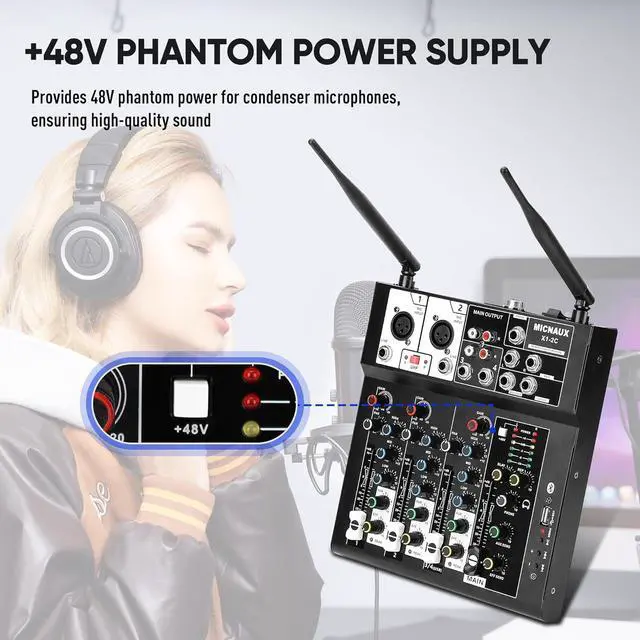 Seamless Bluetooth Connectivity Effortlessly connect your devices wirelessly! The sound board supports Bluetooth-enabled smartphones, tablets, and laptops, letting you stream music with zero loss. With a range of up to 33 feet, youll enjoy flexible, uninterrupted streaming for every occasion. Versatile +48V Phantom Power The karaoke mixer supports condenser microphones with its +48V phantom power, making it ideal for recording, podcasting, small band performances, weddings, and