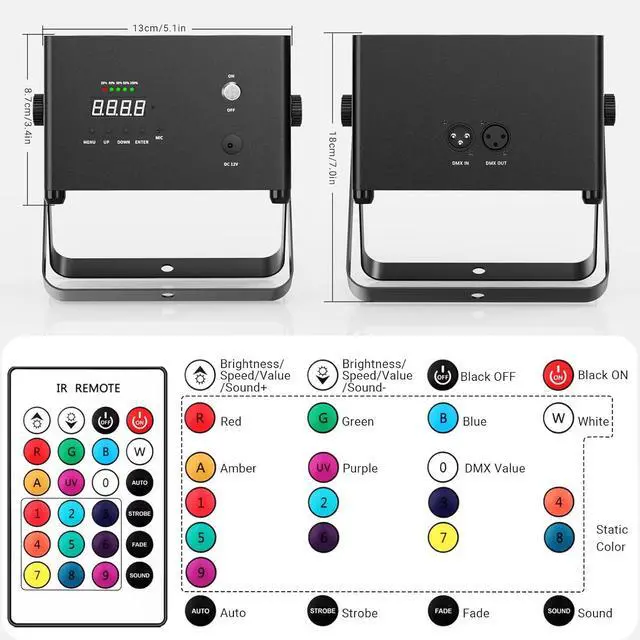 - Advanced Control: Easily operated via remote control, DMX controller, built-in programs, or sound activation. Automatic modes include static color, strobe, dimming, gradual color change, and master/slave setups to suit different occasions.