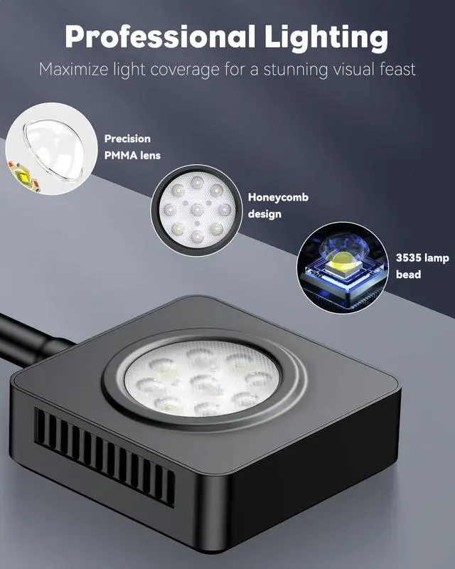 - Professional Lighting: Honeycomb PMMA lens array maximizes light transmission and coverage. Effectively create stunning shimmer effects while highlighting the natural beauty of tank inhabitants. Even light distribution ensures optimal growth throughout