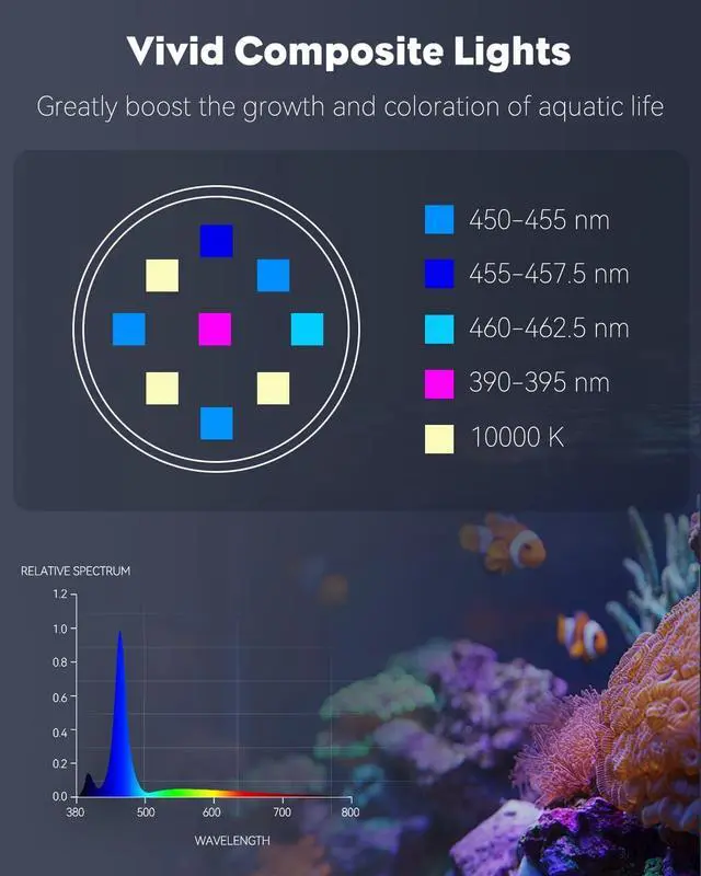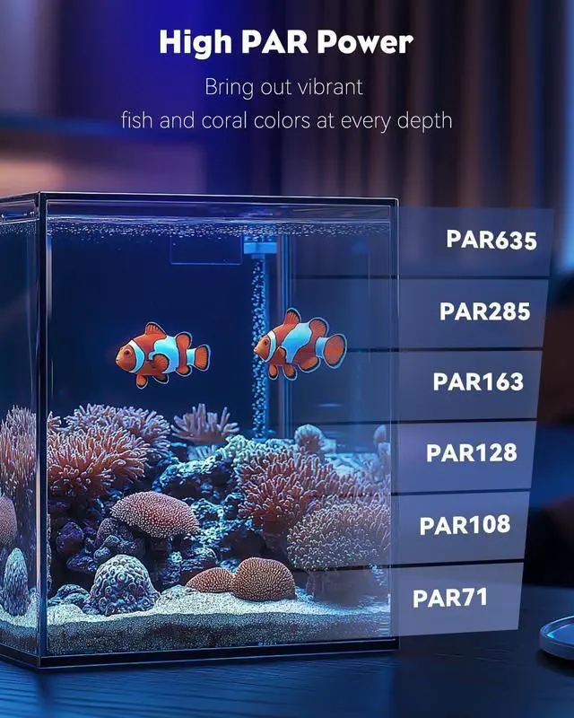 PAR: 300 (at 12" depth). Vivid composite lights greatly boost the coral growth and vibrant colors for a more thriving fish tank