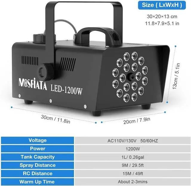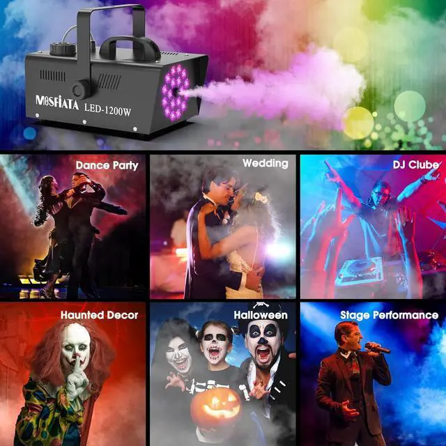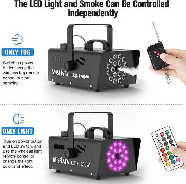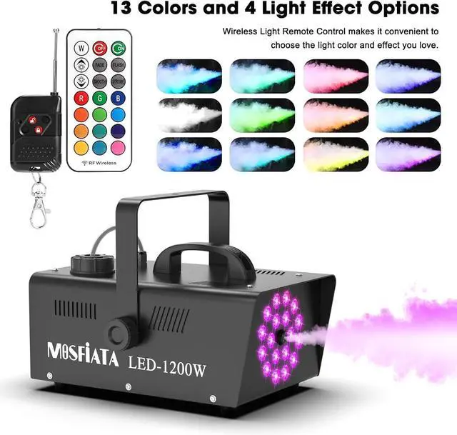 false- [Fog Machine with Light Show] MOSFiATA 1200W smoke machine features 18 RGB LED lights, there are total 13 colors for you to choose from, namely, red, blue, gree or mixed colors, 4 various light effects at different speeds (fade, flash, smooth and strobe), use it to create an unprecedented experience in your party!