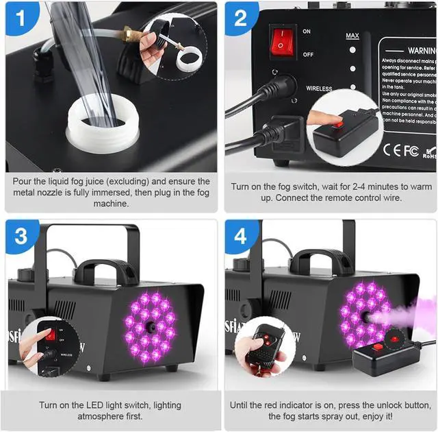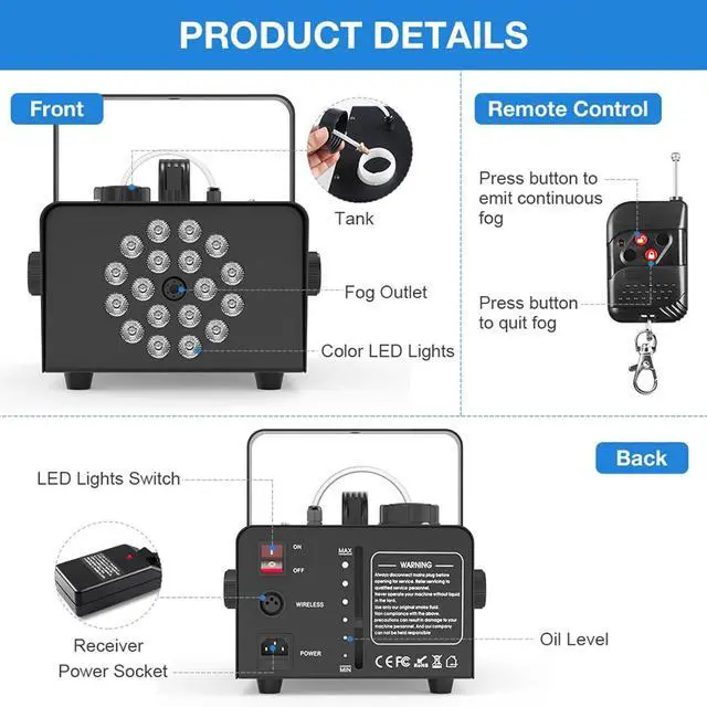 - [Easy To Use]The fog machine with lights comes with both two different wireless remotes controls, one is that you could turn on and turn off the fog machine for easy use and the other is equipped with LED light control buttons, which is convenient for you to freely switch colors. The wireless remote distance can reach 50 FT (no obstacles).