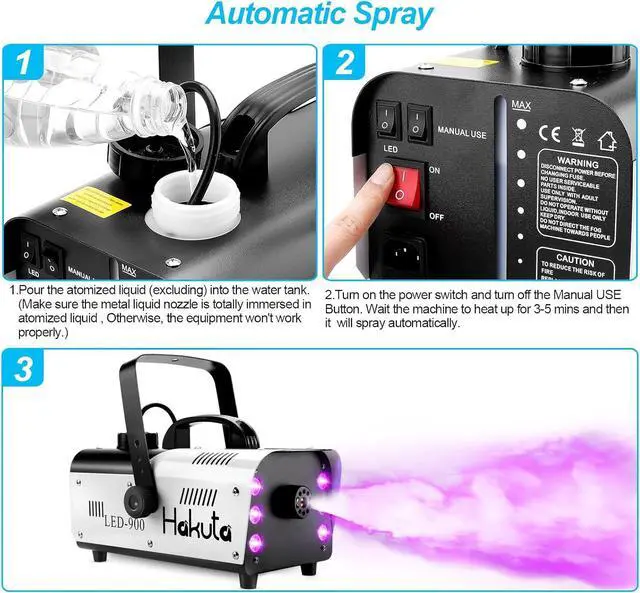 AUTO-SPRAY FUNCTION: This type of fog machine comes with an auto-spray function. All you need to do is to pour the fog liquid into the water tank, turn on the power supply and press the auto-spray button, then the machine will automatically spray after being preheated for 3-5 minutes. Besides, the 6 LED lights can bring you a much cooler stage performance.