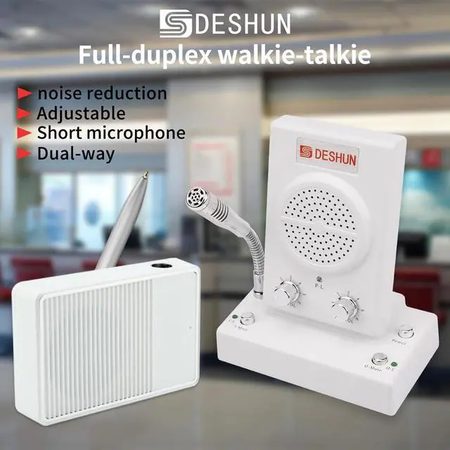 false Two-way intercom technologyDESHUN intercom system uses automatic two-way communication technology, without any operation can automatically identify voice signals, say goodbye to signal delay, can be real-time easy intercom, better experience Machine function upgrade DESHUN intercom system adopts all-metal body design, with better durability. It not only has the function knob to adjust the volume, but also adds the internal and external one-button sound closure function to reduce unnecessary mutual interference Machine quality upgrade DESHUN intercom system uses 4 core high strength aluminum foil shielding wire, anti-interference ability is stronger, avoid howling at the same time, but also to ensure that the sound released sounds clearer and more natural, sound quality is better Easy to install and useDESHUN intercom system, equipped with a full English manual, detailed installation guidance and parameter description, only the host and extension with audio cable connection, power adapter one end of the host link, one end of the access to the power supply Wide application ScenariosDESHUN intercom system is suitable for bank window, hospital window, post office window, securities window, embassy visa office, securities company, scenic spot ticket office, station, restaurant and other places, DESHUN, make communication easier