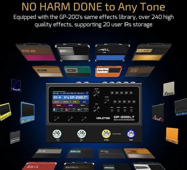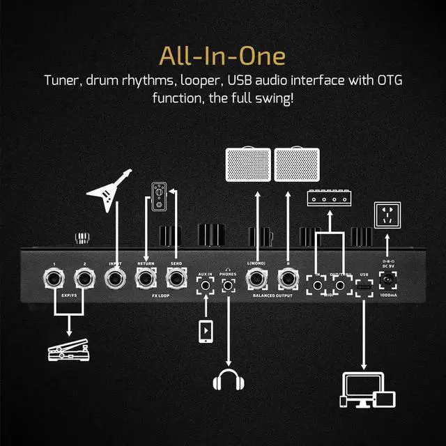 This multi effects pedal has 4.3 -inch TFT color LCD screen with user-friendly UI, Line, and Headphone I/O for various connection needs, FX loop for inserting external stompboxes, MIDI I/O and two EXP jacks for connecting external controllersfalseUSB Type-C Connection Audio Interface with Stereo 6-in 4-out Audio Streaming, Support OTG function for directly Connecting to iOS/Android Mobile Devices For the Guitar Effects PedalfalseMulti Language User Interface (Hardware) with Free Mac/Windows Software for Sound Editing and Presets Managing On the Guitar Pedalfalse- The guitar effects pedal has 240+ Built-in Guitar/Bass/Acoustic Effects with 140 Legendary Amplifiers&Cabinets Simulations and 100 Renowned Stompbox Effect Pedals; Supporting 20 3rd Party IRs Storage; 24-bit 44.1 kHz Signal Processing