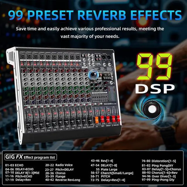 - Preset 99 DSP EffectsThe sound mixer features 99 built-in DSP effects, allowing you to effortlessly switch to the corresponding effect for different scenarios. This versatile professional mixer is perfect for high-quality on-stage performances, live gigs, DJ events, karaoke, and parties.