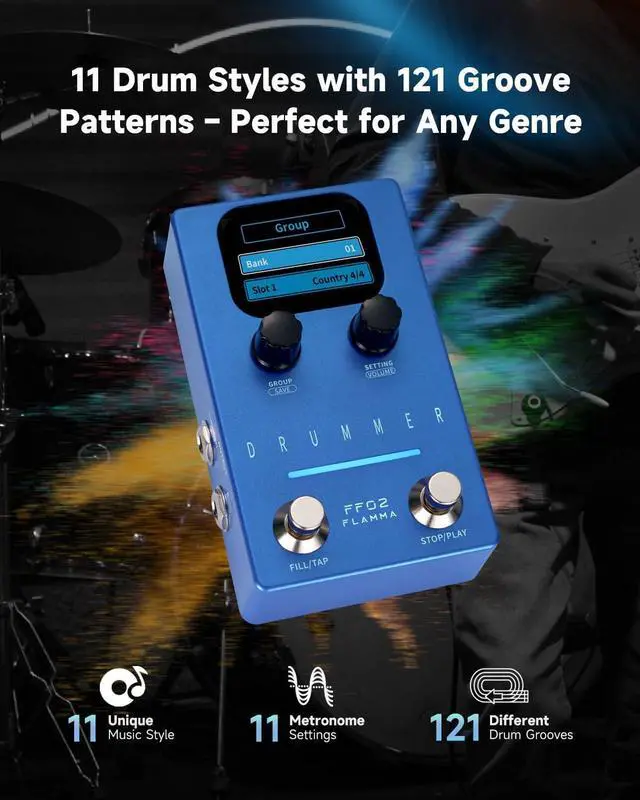 - Save and Customize Rhythms: Provides 66 slots in 11 groups (6 per group) for quick switching of customizable drum loops, perfect as a drum pedal for guitar and a flexible guitar effects pedal for live and studio use