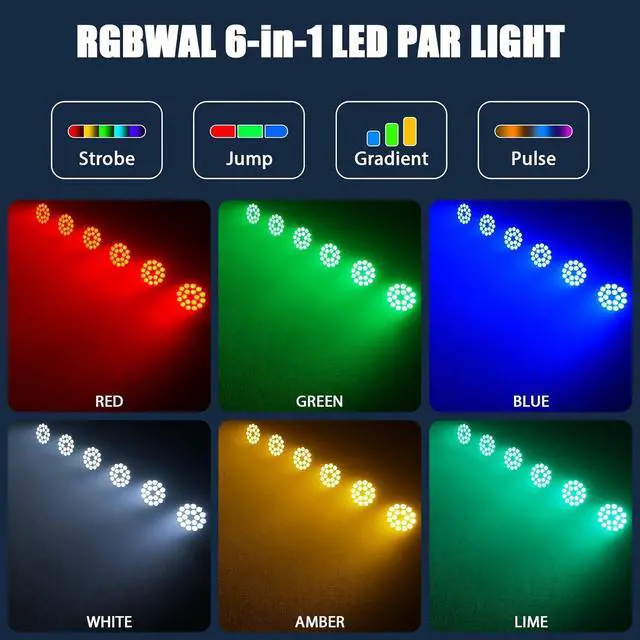 Upgraded Par Lights: This is our latest 6IN1 powerful par light, RGBWAL: red, green, blue, white, amber and lime. Also the most obvious one is lime. The lime and RGB broadens the color gamut, the color mixing is vivid, the color reproduction is high, and it can replace the surface light in full light mode. Moreover our stage light is equipped with 18 lime four-color light sources and 25° high-brightness lens, the colors are bright and the light is soft. Nice LED par lights.