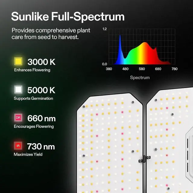 - Full-spectrum Sun-like Lighting: Featuring a dimmable driver, and full-spectrum lighting, this light is ideal for various plants at all growth stages; It delivers optimal full-spectrum light (390nm-730nm, 3000K, 5000K); This feature maximizes PAR output, improving germination rates, promoting plant growth, extending blooming periods, and increasing yields