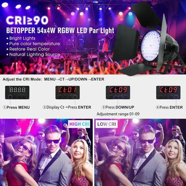 falseAdjustable Light Angle with Barn DoorsThere are 4 barndoors with the stage light, they are easy to install. The barndoors allow you to adjust the angle of the light according to the lighting needs of the scene, providing a more perfect light effect for different scenes. false- CRI>90 Par Light Featuring a CRI over 90 in high CRI mode, this par light provides exceptional color accuracy, ensuring that objects and skin tones appear natural and vibrant. You are able to fully demonstrate creativity in terms of photography, studio lighting and video movie recording.