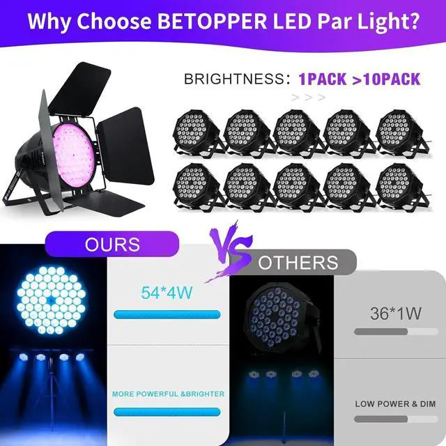 - Superior BrightnessThe Betopper stage light has 54*4W LED bulbs, it delivers up to 5600 lumens, offering industry-leading brightness at an unbeatable price for large venues. This stage lights provides more lighting choices for your activity and brings a glamorous visual effect.