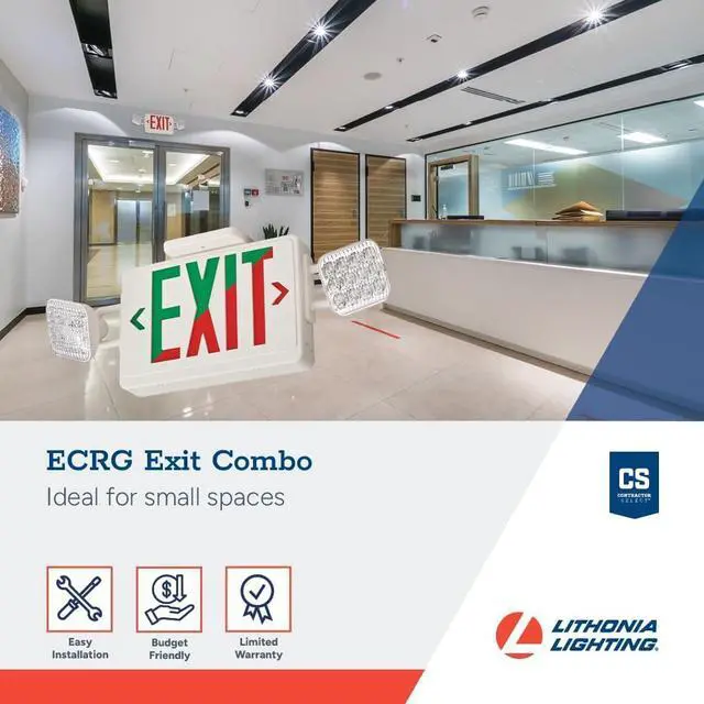 Half: Lithonia Lighting Basics ECRG exit signs with emergency lights now bring convenience with reliability and affordability. The Lithonia Lighting ECRG is a combination of exit and emergency lighting. The ECRG is ideal for safely illuminating the path of egress above-the-door in small spaces that require lower mounting heights while providing 90 minutes of emergency power. This LED exit sign with emergency lights features selectable red or green color, universal mounting options, maintenance-free battery, and remote capacity for connecting additional emergency exit light heads. It meets UL 924, NFPA 101, NEC, and OSHA standards, making it a reliable emergency lighting solution.